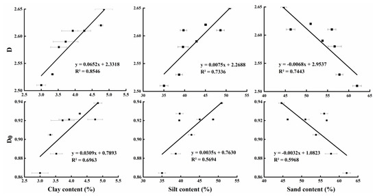 D0 value is highly significantly positively correlated (R2 = 0.6963, p = 0.010) with clay content, significantly positively correlated (R2 = 0.5694, p = 0.030) with silt content, and significantly negatively correlated (R2 = 0.5968, p = 0.025) with sand content (Figure 6), that is, the higher the content of clay and silt and the lower the sand content in soil, the greater the D0 value. The correlation coefficient between clay content and D0 value is the largest and the p value the smallest, indicating the most significant correlation between D0 value and clay content. The relationship between D1 and D2 values and the content of each particle size is generally consistent with D0 values.