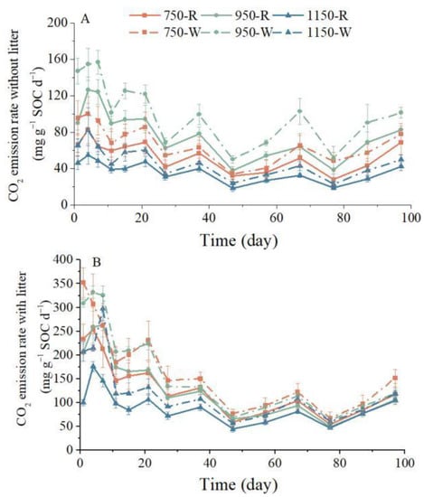 Dynamics of CO2 efflux rate from control (A) and litter-mended soils (B) along the different elevations (750, 950, 1150 m) during the 97 day incubation period. R and W represent room temperature and warming temperature, respectively. The vertical bars are standard errors.