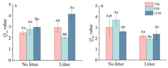 Temperature sensitivity (Q10) of SOC in the control (no litter) and treated (litter input) soils from different elevations (750 m, 950 m, 1150 m) during the 0–37 days (A) and 37–97 days (B) incubation period, respectively. Values are expressed as the means ± SE (n = 4). Lower case letters and the capital letters indicate significant differences between elevations and litter, respectively (p < 0.05).