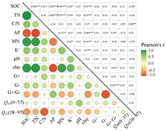Pearson’s correlation coefficient matrix of Q10 with key important influencing variables. Soil properties include soil organic carbon (SOC), total N (TN), C/N, Available P (AP), Mineral N (MN), pH, clay content, Soil microorganisms include Gram-positive (G+), Gram-negative (G-), Gram-positive / Gram-negative (G+/G−). *, ** and *** Denote significant difference at p < 0.05, 0.01 and 0.001, respectively.
