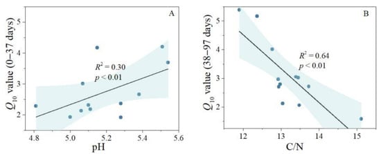 Relationships between the Q10 without litter and pH (A) during the 0–37 days incubation period. Relationships between the Q10 and C/N (B) during the 38–97 days incubation period.