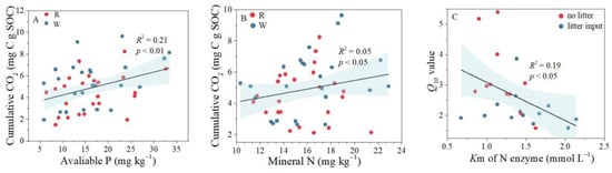 Relationships between the cumulative CO2 (38–97 days) and available P (A) and mineral N (B) after 97 days incubation. The relationship between Km of N enzyme and Q10 (C) in the second stage. R and W represent room temperature and warming temperature, respectively.