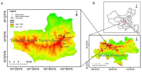(a) Map of the Mt. Taibai study area and locations of the tree-ring sampling sites; (b) location of the Qinling Mountains and the two meteorological stations used in the study.
