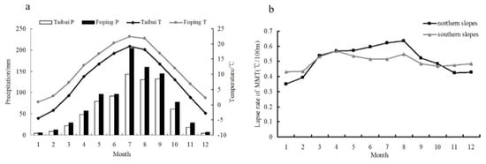 (a) Average annual temperature (T) and precipitation (P) at the Taibai and Foping climate stations, based on data for 1959–2013; (b) the monthly temperature lapse rates on the southern and northern slopes of Mt. Taibai [42].