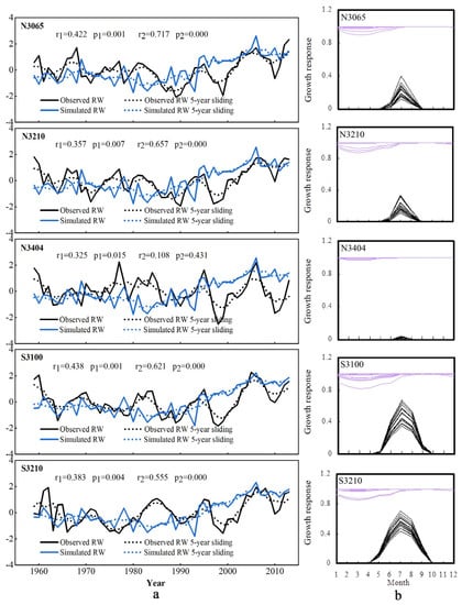 Intercomparison of actual and simulated tree-ring chronologies with the associated seasonal patterns of climate limitations simulated by the VSL model at each site (N3065, N3210, N3404, S3100, and S3210). (a) Comparison between the standard tree-ring width chronology of L. chinensis from the five sample sites and simulation series using meteorological data. Correlation coefficients are given for 1959–2013, where r1 is the original value, and r2 is the 5-year sliding value. (b) Annual and long-term mean monthly growth rates due to soil moisture (gM, purple) and temperature (gT, black) for 1959–2013.