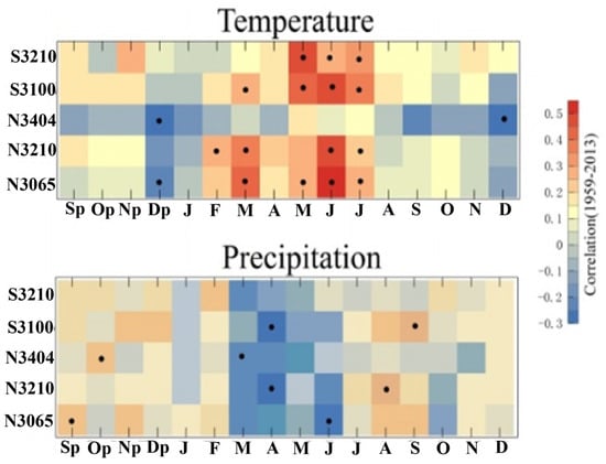 Tree-ring growth responses to temperature and precipitation over 1959–2013 based on statistical model methods. The correlations are calculated from September of the previous year (Sp) to December of the current year (D). The black points indicate the significantly correlated months (p < 0.05).
