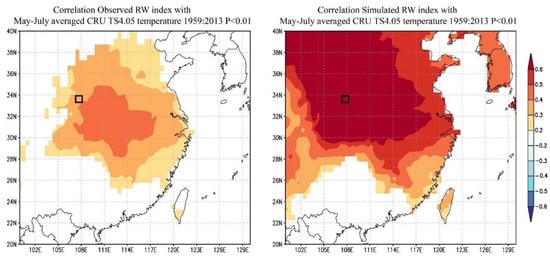 Spatial correlation analysis between the observed and simulated RW index and grid data.