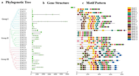 Gene structure analysis showed that the average length of the Eu4CL genes was 1556 bp. The Eu4CL4 gene had the longest length of 2406 bp, containing 18 exons. The EU4CL1 gene had the shortest length of 357 bp, containing two exons. There were significant differences in the number of introns and exons in the Eu4CL genes, and the number of exons was between 1 and 23. Among them, the most abundant exons were found in Eu4CL8 and Eu4CL34, and there were seven genes with only one exon (Figure 1c). Therefore, the number of exons and introns had no significant correlation with gene length.