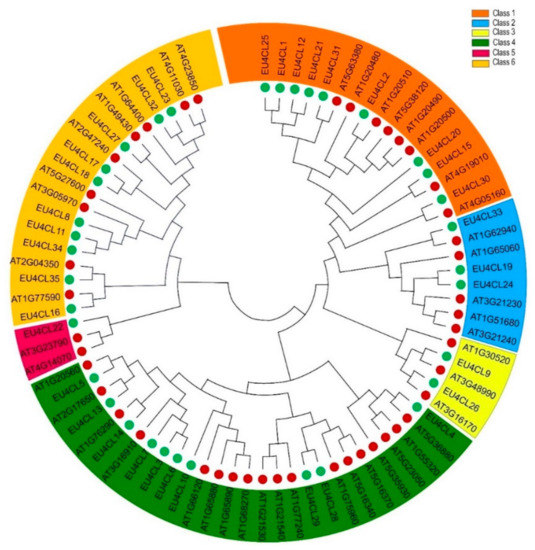 The different-colored arcs indicate different groups (or subgroups) of 4CL domains. The green solid circles and red circles represent the 4CL domain from E. ulmoides and Arabidopsis, respectively. 4CL proteins from Arabidopsis with the prefix ‘At’ indicate ‘At4CL’.