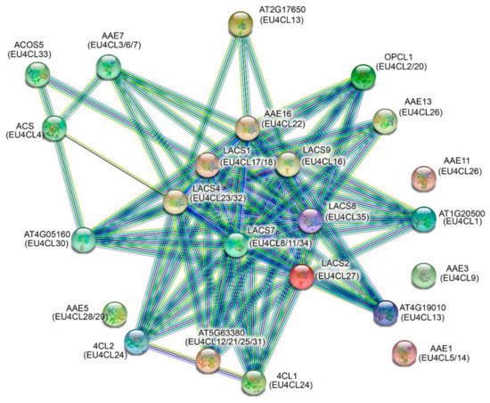The predicted protein interaction network of the Eu4CL protein based on orthologs in Arabidopsis using STRING database.