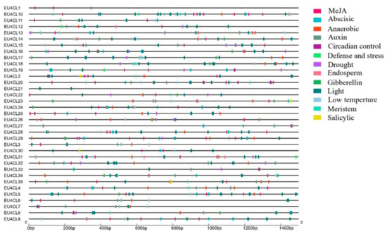 Promoters play an important role in the regulation of gene expression, and cis-acting elements regulate the initiation and transcription efficiency of gene transcription by combining with transcription factors [23,24]. PlantCARE was used to predict the cis-acting elements of Eu4CLs by extracting the promoter region sequence of 1500 bp upstream of Eu4CLs. The promoter region of Eu4CL contained 13 cis-elements, including drought-inducible elements, stress-responsive elements, light-responsive elements, low-temperature-responsive elements, methyl jasmonate-responsive elements, circadian rhythm regulatory elements and salicylic acid-responsive elements (Figure 4). Among these, the light-responsive cis-acting elements were the most abundant. The promoter regions of genes contained light-responsive elements, except for Eu4CL1/23/27. The Eu4CL2 gene contained the least cis-acting elements (only two), while Eu4CL20 contained the most cis-acting elements (21). Different 4CL gene family members have different types and numbers of cis-acting elements, which may explain the different functions and expressions of Eu4CL gene family members.