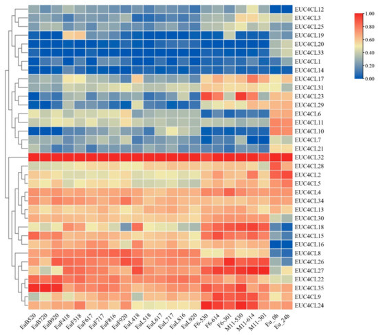 The expression levels of Eu4CL genes were analyzed based on transcriptome data, and the results showed that Eu4CL genes were differentially expressed in bark, leaves, flower buds and fruit of E. ulmoides at different developmental stages (Figure 5). Eu4CL32 was highly expressed in all tissues. The expression trend of Eu4CL15/1618 was significantly downregulated during the development of bark, fruit and leaves, while the expression trend of Eu4CL28/9 was significantly upregulated. The expression trend of Eu4CL23/22 was significantly downregulated with the development of floral buds, and the expression trend of Eu4CL8/16/29 was upregulated, indicating that these genes may be related to floral organ development. However, Eu4CL17/15/9 was specifically expressed on 14 June (the critical period of floral bud differentiation), suggesting that they may be associated with key hormones involved in floral organ differentiation. The expression of EU4CLs in the roots was significantly different from that in other tissues. The expression of Eu4CL6/11/10/7/21/28/2 was specifically expressed in the roots, while the expression of Eu4CL30/18/15/16/8/28/27 was significantly lower than that in other tissues, indicating that the Eu4CL gene family has tissue-specific expression and functional diversity.