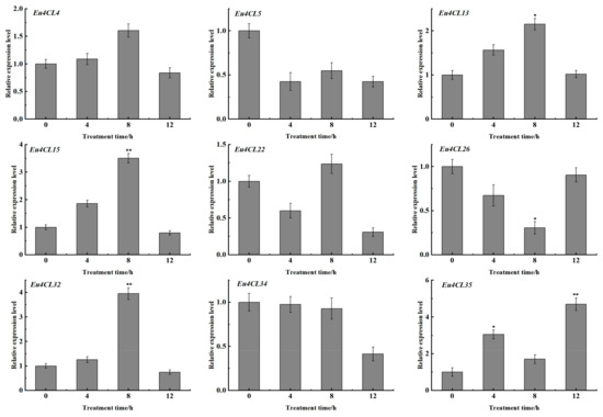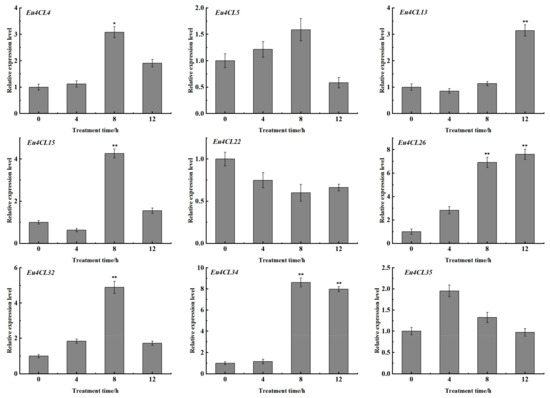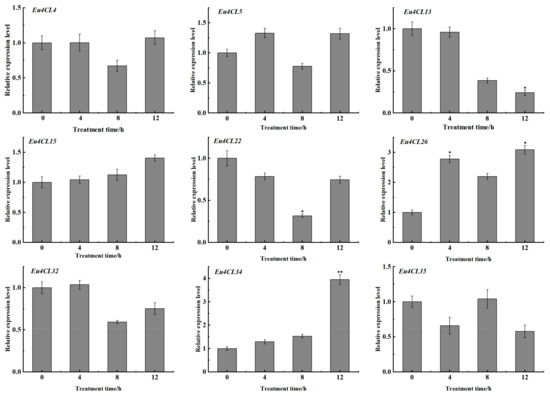 Expression profiles of selected Eu4CL genes under WeJA stress conditions. Error bars show the standard deviation of three biological replicates. * means significant correlation at a level of 0.05. ** means significant correlation at a level of 0.01.