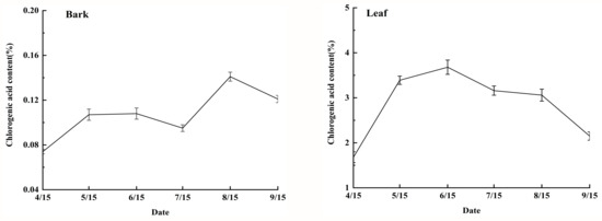 After natural drying, the plant materials were crushed and screened, and the content of chlorogenic acid in the bark and leaves was determined by high-performance liquid chromatography (HPLC) [17].