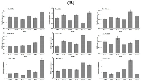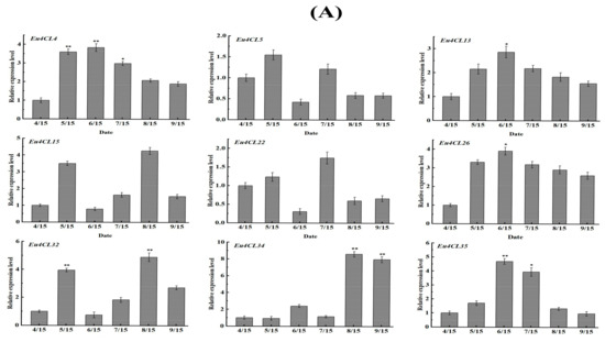 Expression profiles of selected Eu4CL genes in different developmental stages. (A) represents the expression of 4CL gene in leaves at different developmental stages. (B) represents the expression of 4CL genes in bark at different developmental stages. * means significant correlation at a level of 0.05. ** means significant correlation at a level of 0.01.