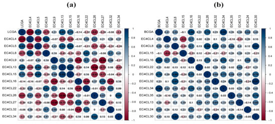 To explore the correlation between Eu4CL genes’ expression pattern and chlorogenic acid accumulation in E. ulmoides, the content of chlorogenic acid and the expression pattern of Eu4CL genes in bark and leaves of E. ulmoides at different stages were detected. The results showed that there were differences in the content of chlorogenic acid in bark and leaves of Eucommia ulmoides at different developmental stages (Figure 9). The content of chlorogenic acid in leaves was high, and increased rapidly at first and then decreased gradually, and finally reached the maximum in mid-June. However, the content of chlorogenic acid in bark was low and increased slowly at first and then decreased gradually, reaching its maximum in mid-August. Selected genes were expressed to varying degrees in bark and leaves of E.ulmoides at different developmental stages (Figure 10). Correlation analysis showed that (Figure 11) Eu4CL4 gene expression was significantly negatively correlated with chlorogenic acid accumulation in the leaves, and the absolute value of the correlation index was greater than 0.9. The expression levels of Eu4CL5 and Eu4CL13 were significantly positively correlated with chlorogenic acid accumulation in the leaves, and the correlation index was greater than 0.8. Eu4CL34 was positively correlated with the accumulation of chlorogenic acid in E. ulmoides bark, and the correlation index was 0.999. It was speculated that Eu4CL4/5/13/34 were significant genes in regulating chlorogenic acid biosynthesis in E. ulmoides.