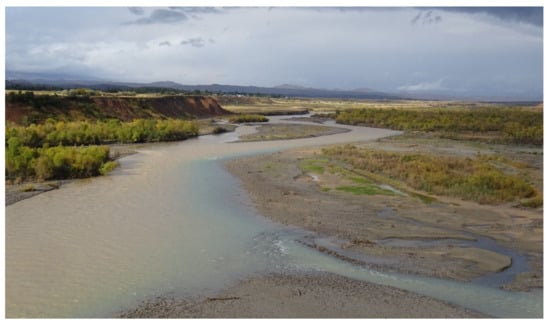 The annual average precipitation at the Naryn City climate station is only 300 mm, with a main rainy season in May and June, but snow and glacier melt of the surrounding mountain ranges additionally feed its run-off, resulting in a typical glacial discharge behaviour peaking in July. Its first 680 river kilometers are still in a natural state without any substantial dams and embankments—nowadays a rarity worth protecting among big rivers of the world. In the river section beginning at Eki Naryn, where its two headwater streams merge, it flows about 160 km down through a broad valley where it has all the space to meander freely, eroding older terraces, raising new gravel banks, forming floodplains with the natural patterns of active braided river reaches (cf. Figure 2). It is here that the Kyrgyz riparian forests, focal theme of this paper, have established predominantly. Due to the active meandering, all succession stages of riparian forests are present all along the riversides and river islands, from bar sediment surfaces to pioneer plots, to young pioneer forests, to fully established forests including disturbance-intolerant tree species and a diverse herbal layer. Dominant tree species are black poplar (Populus nigra), willows (Salix spp.), sea-buckthorn (Hippophae rhamnoides), and tamarisks (Tamarix spp.). This river section ends about 20 km downstream of Ugut Village, where the river enters narrow canyons. (The Naryn River has been described extensively by [8]—for more details about its corridor and hydrology see there).