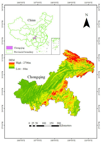 Chongqing is located in southwest China and is an important financial center in the upper reaches of the Yangtze River (Figure 1). Chongqing is the only municipality directly under the central and western regions, with an area of 82,400 square kilometers, and 38 districts and counties under its jurisdiction. It is located in a region that experiences a hot and humid subtropical climate, with an average annual temperature of 16–18 °C. It receives abundant rainfall, with an average annual precipitation of 1000–1350 mm. The population is 32.124 million, and its urbanization rate is over 70%. The terrain is undulating, with the western and central areas being lower and dominated by hills and mountains. The number of good air quality days exceeds 320 days in a year, and the forest coverage rate reaches about 54.5%. In 2021, the gross domestic product (GDP) of the region exceeded CNY 2.7 trillion, which represents an increase of 8.3%, and the per capita disposable income increased by nearly 10% (https://www.cq.gov.cn/zjzq/ (accessed on 6 May 2022)).