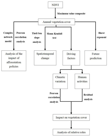 Therefore, our study aims to: (i) analyze the spatial and temporal changes in vegetation cover in Chongqing using Theil–Sen slope analysis and Mann–Kendall tests; (ii) analyze the correlation between vegetation cover and drivers; (iii) quantify the relative contribution of climate change and human activities to vegetation-cover change (iv) analyze the impact of forestry-related ecological policies on vegetation cover using the complex network model and Pearson correlation analysis to investigate the impact of forestry-related ecological policies on vegetation cover, and (v) explore the sustainability and trends of future vegetation-cover changes.