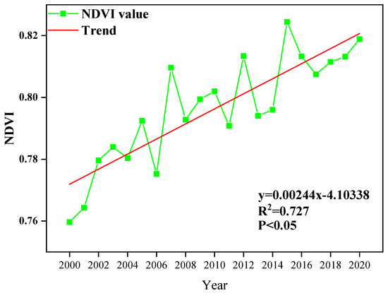 Vegetation plays an important role in terrestrial ecosystems as a link between solar energy and bioenergy, influencing the climate, water cycle, and carbon cycle [1]. Studies related to vegetation-cover changes have attracted significant research attention in several fields [2]. Different vegetation distribution patterns will lead to the formation of different ecological landscapes, and vegetation changes that occur due to natural or human influences will have certain effects on the original ecosystem [3,4]. Therefore, research on the trends of vegetation-cover changes and their driving forces is necessary to inform both researchers and policymakers, allowing them to understand the factors affecting vegetation-cover changes. This can help protect the ecological environment scientifically and effectively [5].