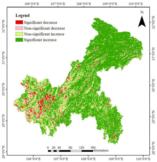 where is the time series in this study and reflects the significance of vegetation-cover change, with the time series trend significant at the 0.05 level when > 1.96 or < −1.96 [49].