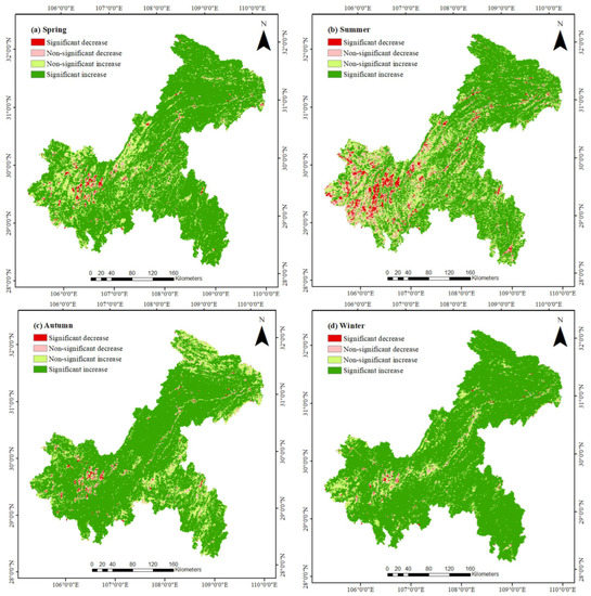 The variation in vegetation cover in Chongqing in different seasons is shown in Figure 5. Greening occurred in 95.76%, 86.35%, 96.01%, and 97.95% of the area in spring, summer, autumn, and winter, respectively, with the overall greening trend being the most pronounced in winter. In spring, the vegetation cover in the northern and southeastern areas of Chongqing exhibited a significant increasing trend, and the areas with significant decreases in vegetation cover were mainly concentrated in the central urban areas, such as Yubei District, Nanan District, and Jiangbei District. The areas that did not exhibit significant decreases were also located in the main urban areas, but they were more extensive than the areas that showed significant decreases, and included areas such as Fuling District and Changshou District. In summer, the vegetation cover in northern and southeastern Chongqing still exhibited significant increases, and the areas with significant decreases were mainly located in the central area, the western area, and the marginal areas of Qianjiang District. The non-significantly increasing areas were scattered throughout Chongqing, and mostly located in the western part of the city. In autumn, vegetation cover increased in most areas, except for the nine central urban areas, such as Beibei District. The northern area, the southeastern area, and the western area experienced an insignificant increase in marginal locations. In winter, the vegetation cover exhibited a significant increasing trend in far more areas of Chongqing than in other seasons. The vegetation cover exhibited a non-significant decreasing trend in areas along the Yangtze River basin, and a significant decreasing trend in the Jiangbei, Nanan, and Yubei districts. The overall vegetation cover exhibited a significant increase, while a few areas in the western and central regions exhibited a non-significant increase.
