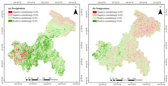 indicates vegetation cover data for the year and indicates the precipitation, temperature, or afforestation area data for the year. If > 0, the two factors are positively correlated; otherwise, they are negatively correlated. Significance tests were also carried out for both factors [39].