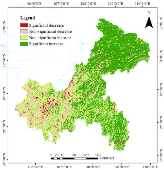 The residual trends with significant increases in vegetation cover were mainly located in the northern and eastern parts of Chongqing, with a total area of 39,176 km2 (Table 4). Non-significant increases were mainly found in the central and western regions, with a total area of 29,522 km2. Human activities had a positive impact on the vegetation-cover changes in areas that showed an increasing trend. Chongqing has implemented policies such as the Natural Forest Resources Protection Project (NFRP)and the Grain for Green Program (GFGP), whose main objectives are to protect natural forests and to restore woodlands and grasslands according to local conditions, respectively, which can have a positive impact on vegetation-cover changes. These ecological protection policies can explain the increasing trend of vegetation cover in some regions. Yubei District, Shapingba District, Jiulongpo District, Dadukou District, Nanan District, and Jiangbei District, which are located in the central area, exhibited a significant downward trend, while the areas that did not exhibit a significant decline were mainly located in the central and western parts of Chongqing. Human activities had a negative impact on the vegetation-cover changes in these areas, with decreasing trends. The results show that vegetation-cover changes are related to human activities, in addition to climatic factors.