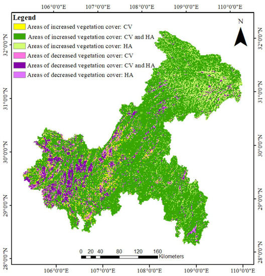 Spatial distribution of drivers of vegetation-cover change in Chongqing from 2000–2020. CV denotes climate variations and HA denotes variations due to human activities.