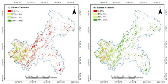 This study analyzed the relative contribution of the two drivers to vegetation-cover change based on multiple linear regression and residual analysis. In areas with decreased vegetation cover, climate change and human activities had relative contributions of 29.61% and 70.39%, respectively. As shown in Figure 9b, 75.48% of the vegetation cover reduction areas were mainly caused by human activities (relative contribution > 50%), and were primarily in the western and northwestern parts of Chongqing. Only 24.52% of the areas with decreased vegetation cover were primarily caused by climate change and were mainly found at the western margin (Figure 9a).