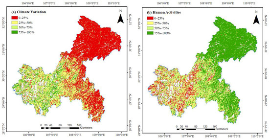 Relative contribution of (a) climate change and (b) human activities on areas of decreased vegetation cover.