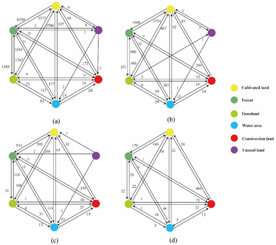 Spatial distribution of land use types in different regions in 2020: (a) significant decrease, (b) non-significant decrease, (c) non-significant increase, and (d) significant increase.