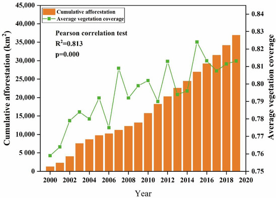 Pearson correlation analysis can describe the correlation between two variables [61,62,63]. In this paper, Pearson correlation coefficients were used to determine the effects of precipitation, temperature, and afforestation area on vegetation-cover changes from 2000–2020. The correlation coefficient (R) is expressed using the following equation: