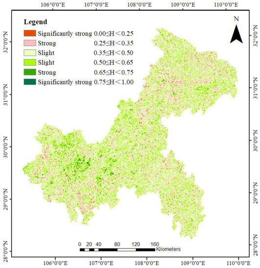 A value of infinitely close to 0.5 indicates that the time series has stochastic characteristics, with little or no sustainability, and the future trend is unrelated to the study period; for < 0.5, the time series is anti-sustainable and the future trend is opposite to that in the study period; for > 0.5, the time series is sustainable and the future trend is the same as that in the study period.