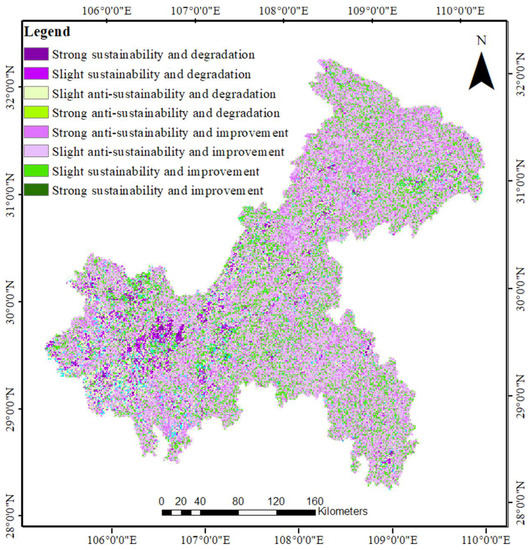 As shown in Figure 3, the average vegetation cover in Chongqing increased significantly from 0.759 in 2000 to 0.819 in 2020. The distribution of vegetation cover is shown in Figure A1. As shown in Figure 4, overall, there was a significant trend towards greening, with 87.37% of the area exhibiting greening and a significant increase in vegetation cover in most areas of Chongqing (Table 2). The areas where the vegetation cover was significantly reduced were mainly central urban areas, such as Beibei District.