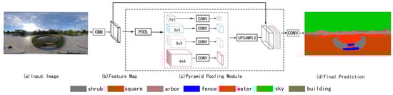 - Zhao, H.; Shi, J.; Qi, X.; Wang, X.; Jia, J. Pyramid Scene Parsing Network. In Proceedings of the 2017 IEEE Conference on Computer Vision and Pattern Recognition, Honolulu, Hl, USA, 21–26 July 2017. [Google Scholar]
