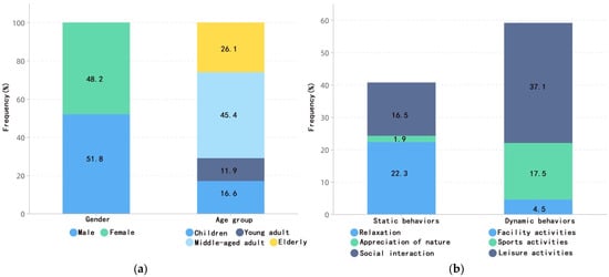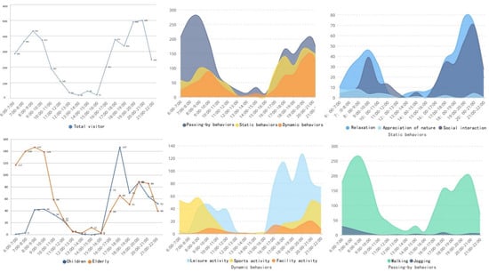 | Dynamic behaviors | ![]() Facility activities (activities dependent on various park facilities) | ![]() Sports activities (sports-related activities such as ball games, dance, etc.) | ![]() Leisure activities (chasing games, taking care of children, picnicking, etc.) | |