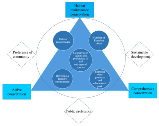 The issues of environmental protection, sustainable development, and conservation received considerable attention in recent years [1,2,4,5,6,7,8,81]. People’s preferences play an important role in the success of wildlife conservation. Using the Kinmen Eurasian otter as an example, this study constructed a utility model of wildlife conservation preferences based on the economic theory of nonmarket goods. This model contributes to the academic development of sustainability, environmental protection, and conservation in the future. Eurasian otters are listed as first-class protected animals in Taiwan and are now on the verge of extinction. Almost no trace of otters are found on the island of Taiwan, and there are fewer than 200 otters on Kinmen Island. Therefore, the conservation of Kinmen Eurasian otters is a very important issue. To understand the Eurasian otter conservation policy and management strategy, the present study used a combination of approaches to explore the Eurasian otter conservation preferences and attributes of residents and tourists in Kinmen. This study then constructed the Kinmen Eurasian otter conservation preference function and explored respondents’ WTP for the conservation of the Kinmen Eurasian otter. Our results show that respondents were very dissatisfied with the current conservation status of Kinmen Eurasian otters.