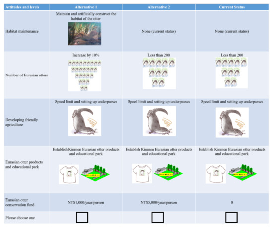 Previous studies found that the number of endangered species affected people’s preferences for conservation programs [36,37]. Therefore, the present study assumed that the number of Eurasian otters would also affect the preferences of Kinmen residents and tourists for conservation alternatives. The “number of Eurasian otters” was included as an attribute to understand respondents’ preferences toward the Kinmen Eurasian otter conservation program. The present study set the “reduce by 20%” and “increase by 10%” numbers of Eurasian otters as two additional levels.
