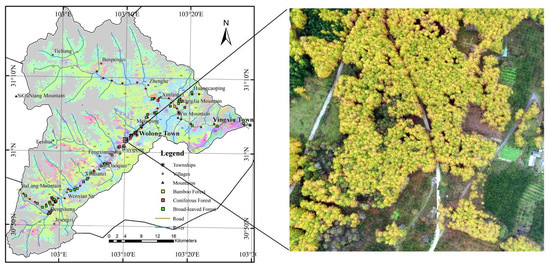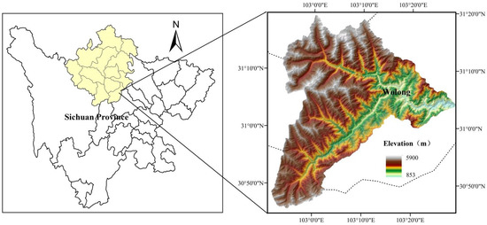 The Wolong Nature Reserve in Wenchuan County and Sichuan Province, with latitude 30°45′37″ N~31°19′23″ N and longitude 102°51′44″ E~103°29′11″ E, is the research object of this study while covering an area of 1736.81 km2. Wolong Nature Reserve is located in the junction of the mountainous area and plain area, with the highest elevation of 6132 m in the west adjacent to Mountain Siguniang and the lowest elevation of 898 m in the east to Yingxiu Town of Wenchuan City, which is the end part of Zipingpu Reservoir, with an overall average elevation of 3544 m a.s.l. (Figure 1). The DEM data was obtained from ESA’s PALSAR 12.5 m resolution. The topography in the area was undulating, with an average slope of 31.4°. The slope of the area above 25° reached 74.7%, among which the slope of the Zhenghe River and the north, as well as the south sides of the Yuzi River, demonstrated the most obvious undulation (Figure 2).