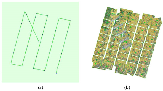 The UAV equipment is DJI Phantom 4 Pro, which utilizes Flight Autonomy technology, quadrotor UAV as the flight platform with 6 vision sensors, main camera, 2 groups of IR sensors, 1 group of ultrasonic sensors, GPS/GLONASS dual-mode satellite positioning system, IMU and compass dual redundant sensors. DJIGS Pro was used as the ground station system for field image data acquisition. The effective pixels were 20 million for the single-lens visible sensor and the single-frame resolution was 5472 × 3648 pixels. The UAV images were acquired in October 2020. The flight height of the UAV was determined to be 120 m. The latitude cover was between 31°1′33″ N–31°1′40″ N, whereas the longitude cover was between 103°10′1″ E–103°10′8.4″ E. The total covered area was 0.578 km2, with an average ground sampling distance (GSD) of 3.79 cm. The UAV flew in the horizontal direction according to “s” trajectory. The flight trajectory is shown in Figure 3a, and the map of the photographed features is shown in Figure 3b.