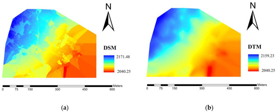 In this study, as the tree canopy height was estimated for the study area, the sample area with high forest depression was selected. The field sample site photo and the 3D point cloud images generated by the UAV are shown in Figure 4. The Digital Surface Model (DSM) and Digital Terrain Model (DTM) generated by the UAV with a resolution of 3.79 cm are shown in Figure 5. The GSD criterion was used to define the spatial resolution of DSM/DTM. The threshold segmentation used for point cloud segmentation is the most common method to determine the maximum variance between classes, namely the OTSU method [26].