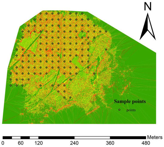 As shown in Figure 4a and based on the field sample survey, the canopy closure in the area was between 0.7–1. There were 60 trees in the 10 m × 10 m sample square with a density of 1, while most of the trees are in the growing stage. The tree crown width was between 1–2 m, and the average tree height was about 9–11 m. The tree forest occupied about 40% of the UAV area (Figure 3). While using the systematic sampling method, 420 sample points were taken with a sampling spacing of 20 m. After eliminating the non-tree areas and some sample points located in the clearing, 152 sampling points were finally left (Figure 6).
