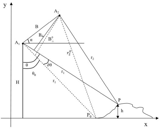 A1 and A2 represent two antenna positions, the baseline B is the distance between A1 and A2, r1 and r2 are the distance of the antenna to ground point P, h is the elevation of P, P0 is the point on the reference plane equidistant from A1 to P, θ and θ0 are the point view of A to P and P0, ɚθ is the amount of change in the view of A1 from P0 to P. The angle between the baseline and the horizontal direction is α, and B⟂ is the component of B in the vertical SAR line of sight direction.