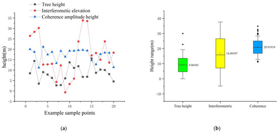 Two machine learning methods were used to build the regression models in this study. Figure 8 and Figure 9 show the input and output tree height data of the model, and other model input parameters, respectively. Figure 9 shows the box plot and line plot of the three-tree height distribution of some sample points, namely, the actual tree height, the tree height of DEM differential interference method and the tree height of coherence amplitude method.