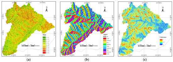 The slope map (a) aspect map (b) and coherence coefficient map (c) of study area.
