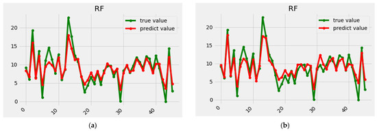 Fitted results of two InSAR methods with random forest. The left (a) represents a comparison between interference difference tree heights fitted using random forest and the right (b) represents a comparison of coherent amplitude tree heights fitted using random forest.
