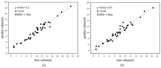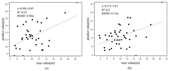 As shown in Figure 15a, the root mean square error of tree height prediction using multilayer perceptron was found to be 3.96 m, and the linear fit between the predicted and true values was 0.25. Its accuracy is lower than the accuracy of 0.95 by using random forest. The reason for this result could be attributed to the random forest which is an ensemble learning algorithm with strong model generalization ability. Even though the multilayer perceptron can be used to infer unknown relationships between data, its arithmetic power is still limited. Moreover, a multilayer perceptron is a single learner with the characteristic of a “black box”, while having slightly lower stability than that of the random forest.