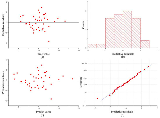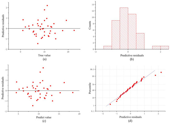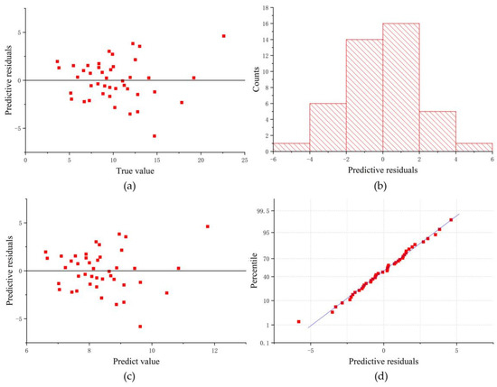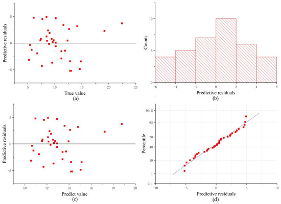 DEM differential interference method with multilayer perceptron estimation of height residuals: (a) predicted residuals of true tree height; (b) counts of predicted residuals; (c) predictive residuals of predicted value; (d) percentile of predictive residuals.