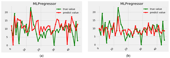 The fitted results of two InSAR methods with multilayer perceptron. The left one (a) represents the comparison of interference difference tree heights fitted using multilayer perceptron, and the right one (b) shows the comparison of coherent amplitude tree heights fitted using multi-layer perceptron.